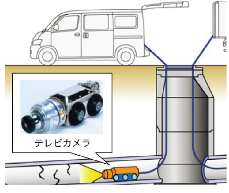 人が直接入ることができない800mm未満の小口径の下水道管については、自走式特殊テレビカメラを導入し、マンホールからカメラを挿入して、破損やクラック等の劣化状況を調査している(図-2)。