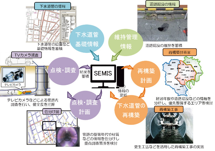 当局では、管路施設に関する様々な情報を、下水道台帳情報システム(Sewerage Mapping and Information System:通称SEMIS)において一元的に管理し、補修や再構築等の計画立案、工事発注に活用している(図-6)。