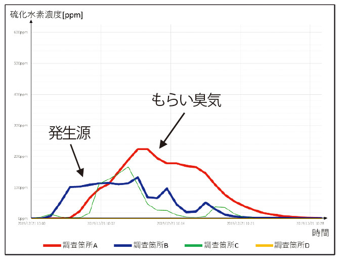 これにより、面的な測定データの解析や視覚的な硫化水素濃度の時間的推移の把握を可能としたことに加え、複数の測定結果を合成表示することにより、発生源ビルからの影響(もらい臭気)を判定することが可能となった(図-7)。