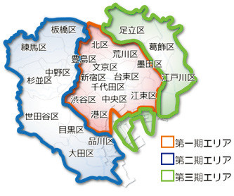 再構築は、区部を整備年代により3つのエリアに分け、最も整備年代の古い都心4処理区を第一期再構築エリアに位置付け、優先して進めている(図-9、図-10)。