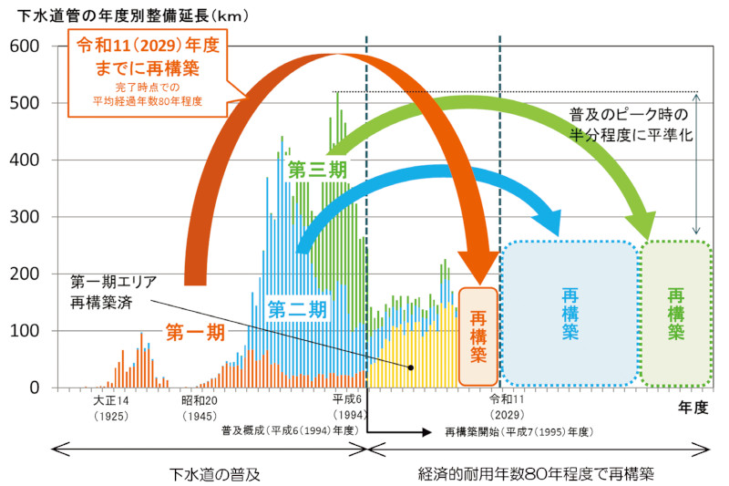 さらに、第一期再構築エリアの完了を見据え、都心部に次いで整備年代が古い第二期再構築エリアにおいて、円滑に事業を進めていくため、令和7年度より試行工事に着手することとしている。