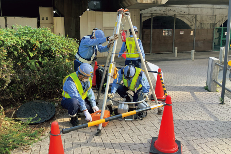 地上においては交通量の多い道路上や狭隘で建物などが近接する路地、下水道施設に至っては地下深く墜落転落のおそれ、下水道管の中では常時下水が流れている状況から硫化水素等の有毒ガス対策や流速・水位などへの対応が欠かせません。