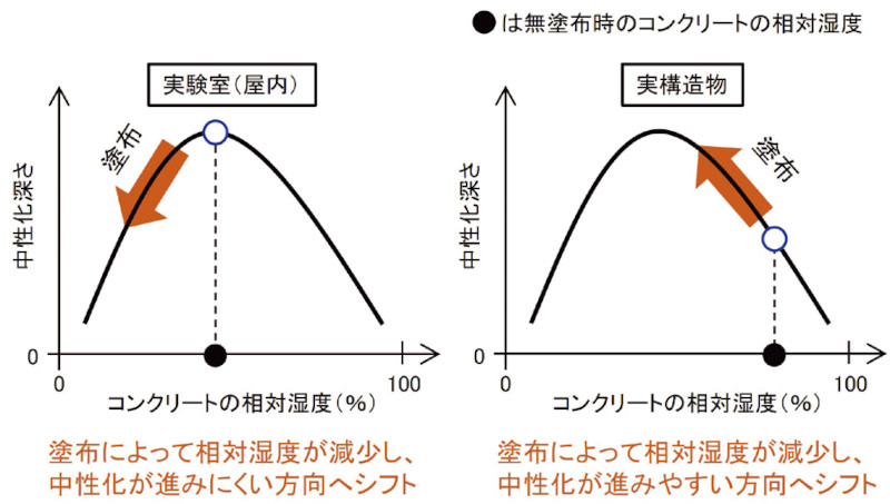 このことから、室内の供試体はあらかじめ中程度の湿度環境に静置されているため、塗布によって中性化が進みにくい方向へシフトするが、実環境は一般に湿度が高く、部位の環境によっては塗布によって中性化が進みやすくなることがあると言える。