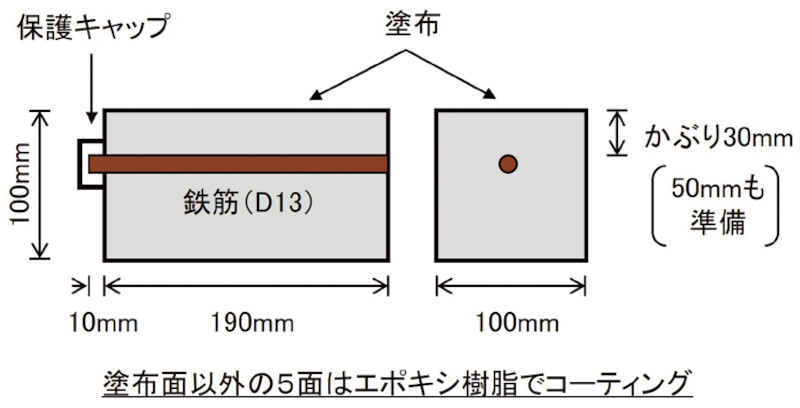 実構造物に見立て、D13鉄筋(腐食防止のためエポキシ樹脂塗装鉄筋使用)を2本埋設した。
