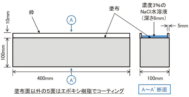 塗布後、試験水として3%濃度のNaCl水溶液を6mm張り、-18℃で16時間、23℃で8時間の1日1サイクルの凍結融解を与えた。