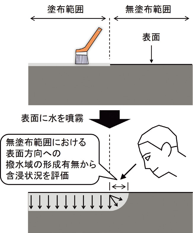 これに鑑み、近年は図-3に示すように、塗布したシラン系表面含浸材は深さ方向に加えて表面方向へも含浸することに着目し、表面の一部に無塗布範囲を設定し、塗布範囲と無塗布範囲の境界から無塗布範囲側の表面に撥水域が形成されていることを目視で把握することにより、深さ方向への含浸の有無を非破壊で管理する方法も示されている5)。