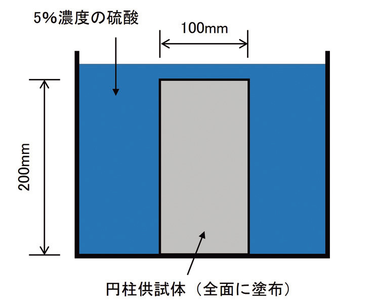 円柱の全面に塗布した後、供試体を5% 濃度の硫酸溶液に浸漬させ、1週間おきに質量減少率を調べた。