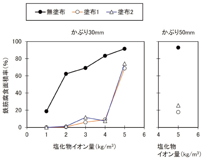 なお、塗布した方は、かぶり30mmにおいて、4kg/m³から5kg/m³にかけて鉄筋腐食面積率が大きく上昇している。