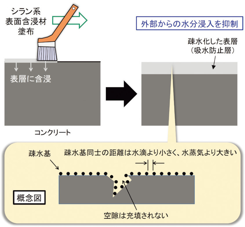 シラン系表面含浸材は、吸水抑制を図るため、コンクリート表層を疎水化させる含浸性の補修材料である。