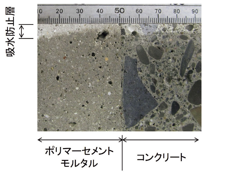 適切な施工により、コンクリートやポリマーセメントモルタルの硬化体に吸水防止層を形成させることができる。