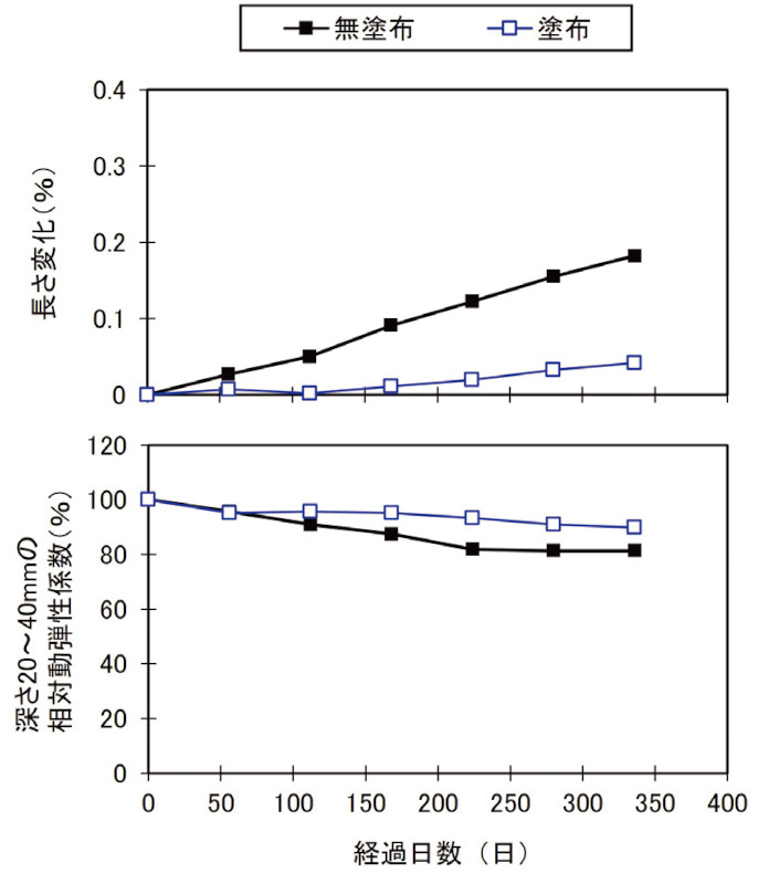 供試体にはASRの劣化因子であるアルカリと反応性骨材が含まれているが、もう一つの劣化因子である水分の浸入が塗布によって抑制されたことでASR が進行しにくくなり、無塗布に比べると長さ変化の増加および相対動弾性係数の低下がともに抑えられている。