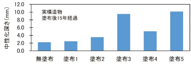 図-9は塗布後15年経過した実構造物で測定した中性化深さの測定結果である。