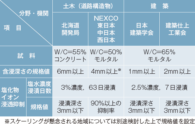 このため、厚い吸水防止層の形成は補修効果を持続させる観点から極めて重要であり、機関によっては、表-1に示すように製品選定の目安として、所定の試料に塗布したときの含浸深さや、試料に形成された吸水防止層の塩化物イオン浸透抑制に関する規格値が定められている1)~4)。