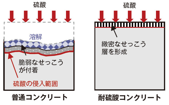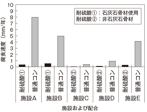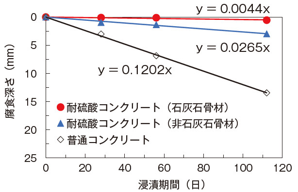 一つは骨材に石灰石を使用したもので、耐硫酸性が高く、硫酸による劣化速度は通常のコンクリートの1/10以下となる。