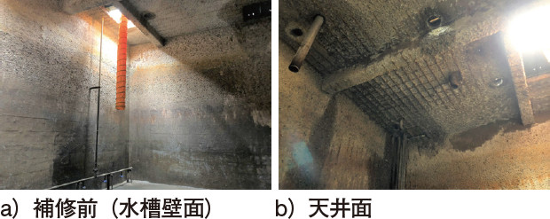 供用開始から40年以上が経過しており、気相部のスラブ下面や壁面に広範囲に鉄筋の露出が確認されたことから(写真-2a))、補修することとなった。
