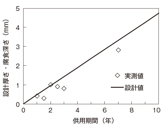 これらから計算した設計厚さと、現地の7年までの腐食深さの実測値を図-6に示す。