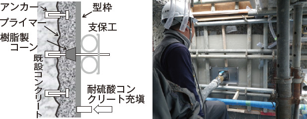 下水処理場での硫酸への対策として、耐硫酸性を持つ樹脂等を用いてコンクリート表面を数mmの厚さで被覆する防食被覆工法が広く普及している。