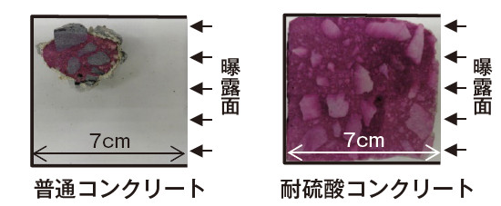 普通コンクリートは7cm角の試験体が曝露4.4年間でほぼ溶解したのに対し、耐硫酸コンクリートは表面付近が若干欠損した程度であり、硫酸はもとより、下水環境においても高い耐硫酸性を示すことを確認した。