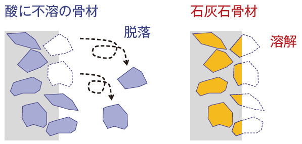 これは、酸に不溶の非石灰石骨材を使用した場合、骨材周囲のペーストが劣化すると骨材が脱落し、骨材の粒径分だけ急激に劣化深さが大きくなるのに対して、石灰石骨材は、周囲のペーストと同じ速度で緩やかに溶解し、脱落しないためである(図-5)。