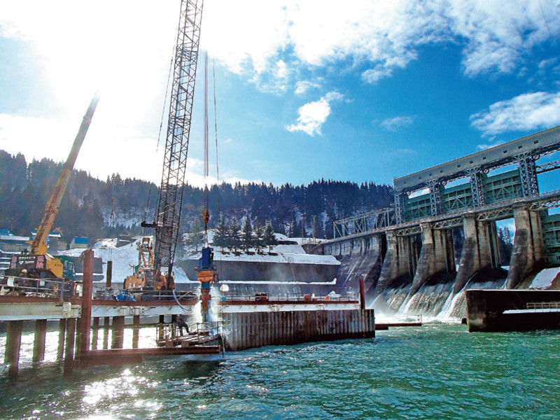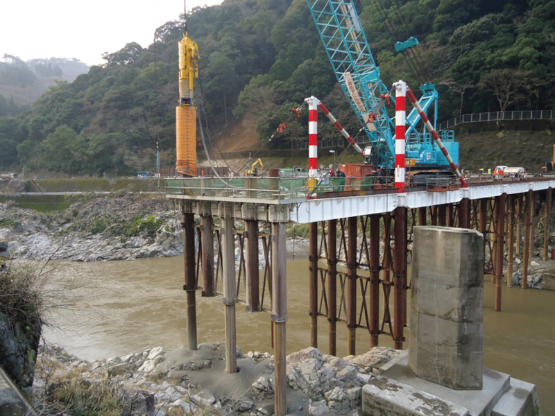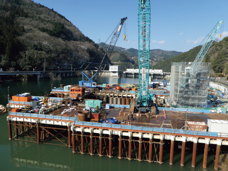 従って、ダムのリニューアルや機能追加工事では、ダム湖特有の数10mに及ぶ大水深、ダム下流の硬質岩盤層への根入れが求められる工事用道路や作業構台工、鋼管矢板を必要とする堅固な締切工等の、重仮設工の確実かつ急速な施工が工事の成否を決定付ける不可欠の要件となる。