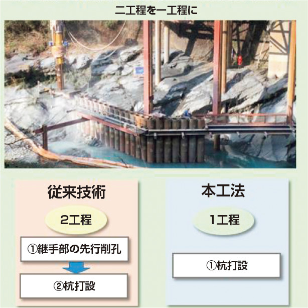 この特殊形状継手(呼称:マイクロジョイント)と拡径式ダウンザホールハンマを組み合わせることにより、河床堆積層や岩盤層への直接打ち込みを可能にし、一般的な鋼管矢板の二工程施工の実現により工期短縮(工程数低減および日施工量増加)を実現した(図- 3)。