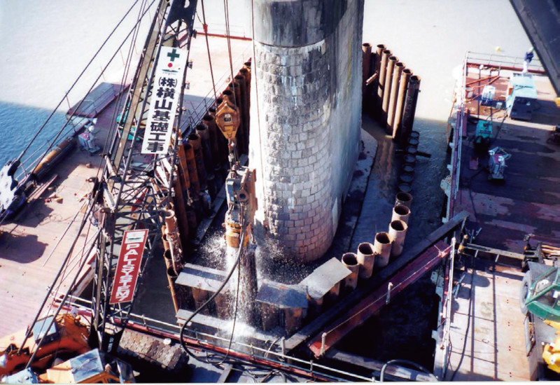 その確実な互層の硬質地盤への打設能力に加え、施工装置をクレーン吊り下げ式に構成することで、従来の杭打ち機施工では困難な重機〜杭心間距離を自由に選ぶことができ、加えて掘削置換〜杭打ち込み、掘削〜杭建て込みという従来2工程の硬質地盤の杭打ち工程を1工程化し、仮橋や仮締切りの徹底した急速施工を実現した。