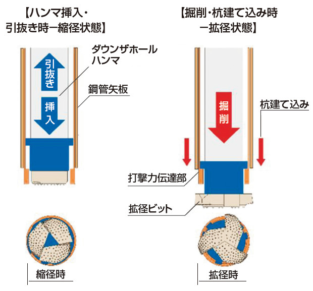 この、LIBRA工法を支持する鋼管杭と、MJP工法の鋼管矢板では、上記の崩壊性の互層の硬質地盤に対応し、鋼管(本管)内にダウンザホールハンマを挿入し、拡径式ビットで鋼管径よりも僅かに大きい径で削孔しつつ、本管を孔内へ同時に打設する方法を用いる。