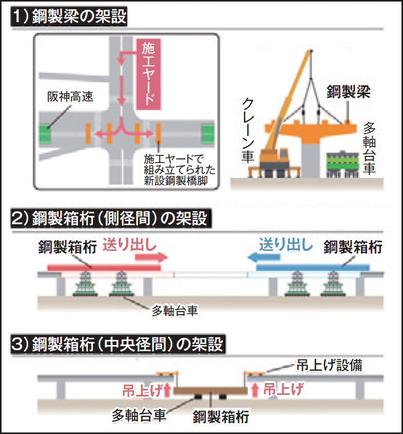 新設橋梁は、荷重軽減と工期短縮を図るため鋼製とし、側径間は隣接する高速道路上で地組みし、送り出しにより架設した。