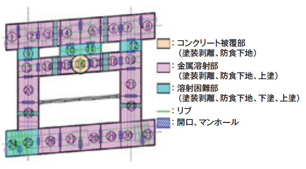 防食工は、耐アルカリ性に優れる亜鉛アルミニウムによる金属溶射を基本とし、溶射困難部(施工空間が確保できない箇所や添接部で金属溶射が適さない箇所)は重防食塗装、コンクリート被覆部(躯体コンクリートが設置される鋼製基礎上面や耐震補強のためモルタル充填される箇所)は有機ジンクリッチペイント塗装とした。