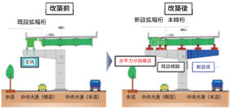 拡幅桁を支持していた鋼製橋脚は梁を拡幅し、鉛直荷重を支持する支承は設置せず、地震時水平力に対してのみ機能する水平力分担構造を設置することで、橋梁全体での耐震性の確保も可能となった(図- 12)。