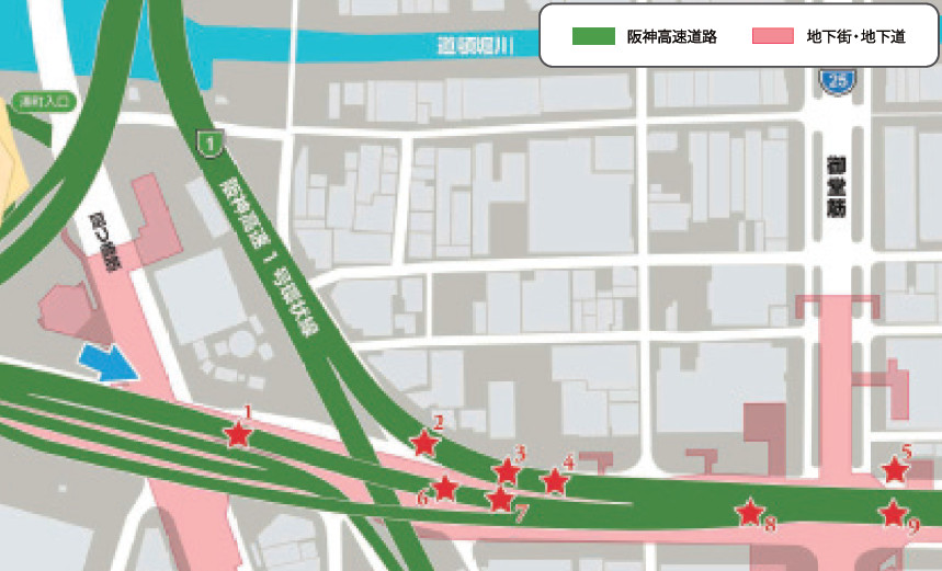 15号堺線の湊町付近は、大阪の中心部であるミナミの繁華街を横断する区間であり、その地下には建設当時から複数の鉄道の駅や地下街が上下に重なり合うように張り巡らされていた。
