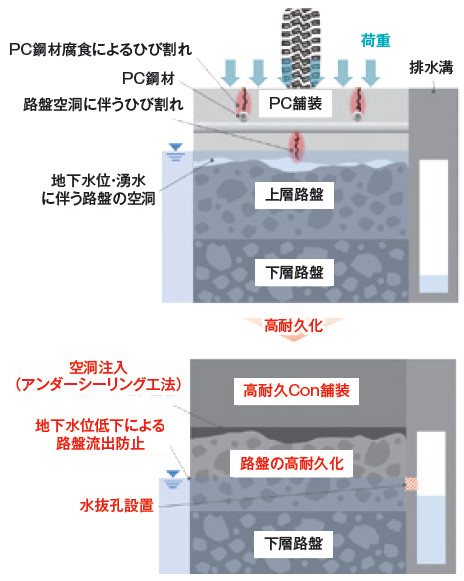 新神戸トンネルは、老朽化による構造物や設備関係の損傷のほか、建設当時は耐久性に優れると考えられていたPC舗装(プレストレストコンクリート舗装)におけるPC鋼材の破断といった、長年の過酷な使用環境の影響による損傷も発生している。