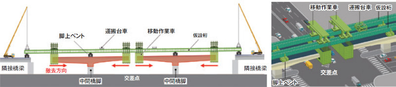 切断したコンクリートブロックの搬出は高速道路経由で行うことで、撤去に係る一連の作業を交差点上空で完結させ、交差点への交通影響を最小限に抑える撤去工法を採用した。
