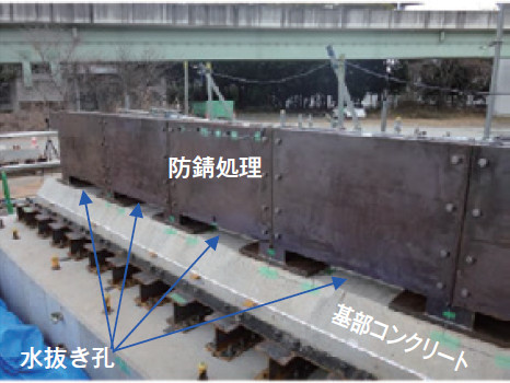 鋼製フーチングには腐食対策を施すとともに、外周全面にコンクリートボックスを設置することで、耐食性の向上や地下水の流入対策、維持管理空間を確保する。