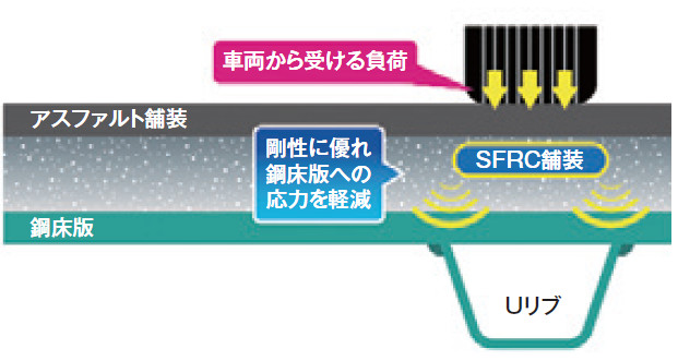 深江浜付近では、Uリブを有する鋼床版で疲労き裂が新たに発見されたため、当て板等の恒久対策に加えて、鋼繊維補強コンクリート(SFRC)舗装等により鋼床版の剛性を向上させることで、き裂の進行を抑制し、鋼床版の長期健全性を確保する(図- 3)。