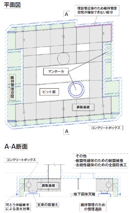 躯体コンクリート工においては、鋼製基礎の上面・側面に設置して遮水壁とするとともに、将来的にブラストや金属溶射等による補修を可能とする維持管理空間を設けた。