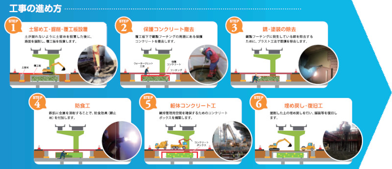 その後、覆工板下で既設基礎の保護コンクリートを撤去し、錆・塗装の除去、防食工、躯体コンクリート工・防水工、埋め戻し・復旧工と進めていく(図- 8)。