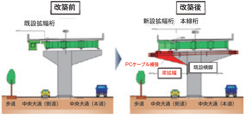 既設桁のみを支持していたRC橋脚の梁部を拡幅し、既設拡幅桁の撤去・架け替えを行い、支点位置を既設桁に統一し、上部工を一体化することで縦目地を解消した(図- 11、写真- 9)。