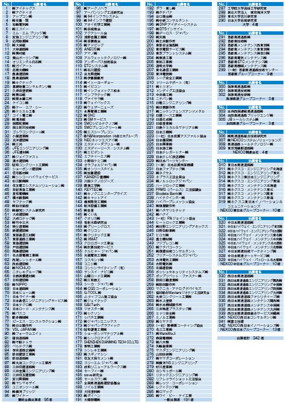 今開催も、高速道路会社6社のほか、高速道路に関連する多くの企業や大学から過去最大「342者」の出展があり、数多くの新技術・新工法、資機材、現場の支援システムなどが会場を盛り上げた。