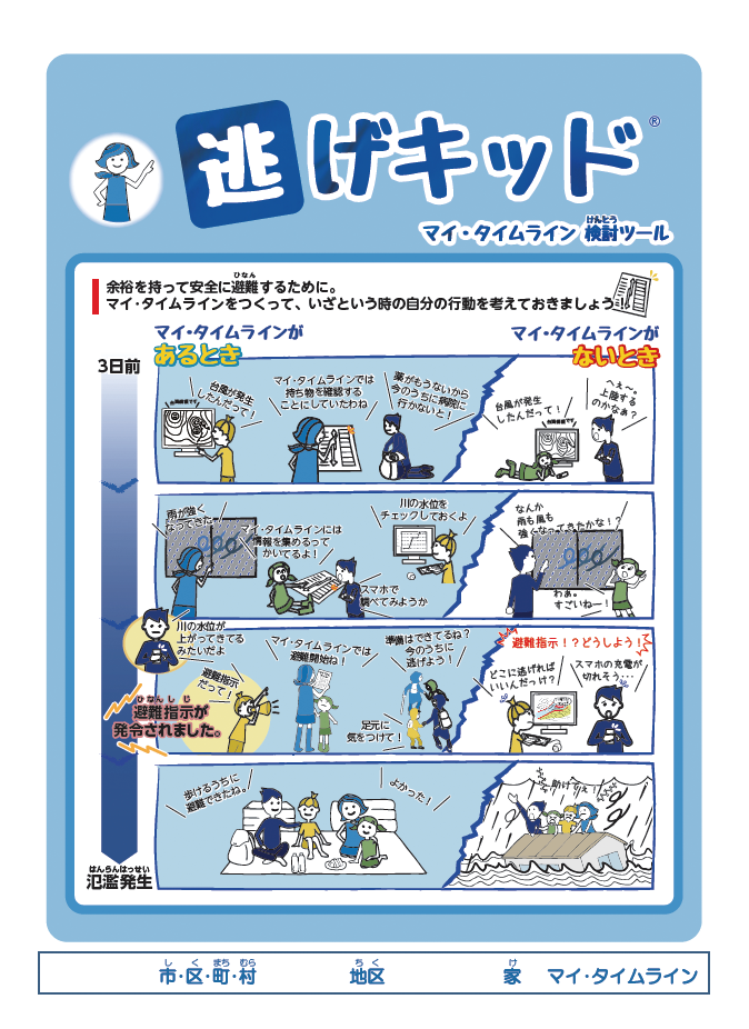 マイ・タイムラインとは、住民一人ひとりが家族構成や生活環境、立地条件等を考慮した上で、「いつ・何をするのか」を時系列に沿って具体的に決めておく「防災行動計画」である。