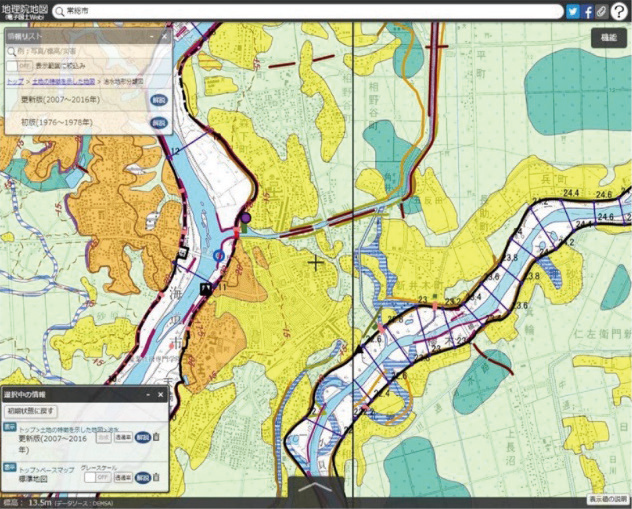 これらを浸水想定区域図や浸水継続時間などと合わせて確認することで、想定的かつ潜在的な水害の危険性を知ることができる(図- 4、5)。