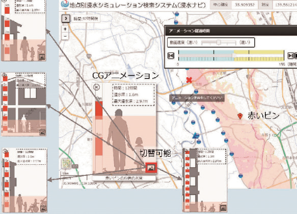 浸水ナビでは、地点別の破堤後の浸水シミュレーショングラフや浸水域のアニメーションを確認できる。