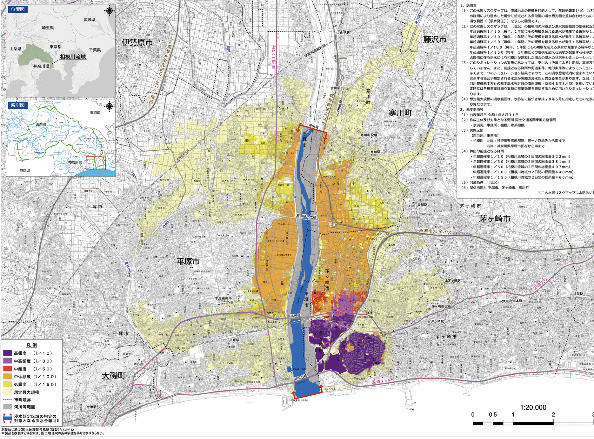 水害リスクマップは、それらを重ね合わせて浸水範囲と浸水頻度の関係を示した図である。