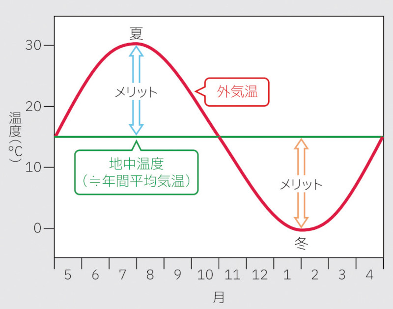 深さ十~数百m程度の地中温度は、その地域の年間平均気温とほぼ等しくなり、年間を通じて10~20℃程度と一定で、夏は外気温より低く、冬は外気温より高くなります(図- 2)。