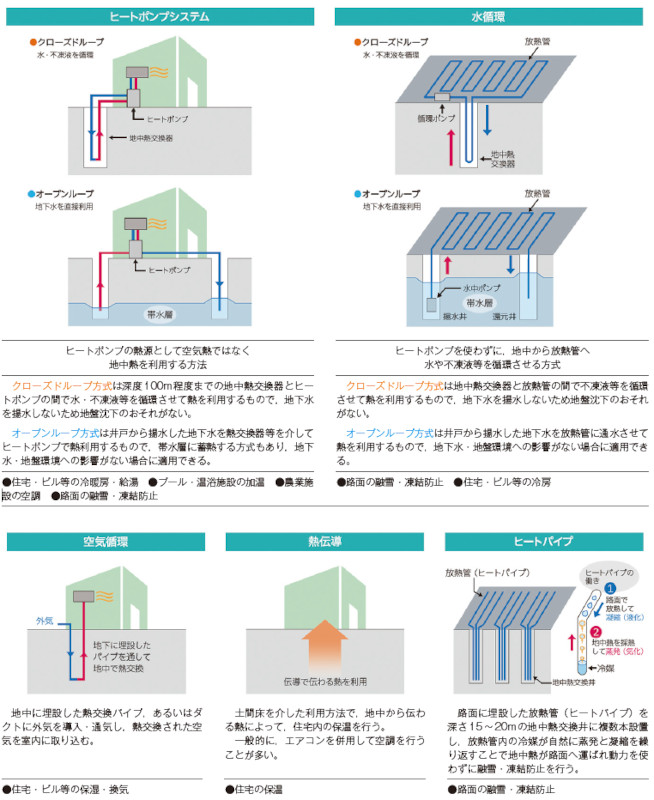 その他にも、放熱管に地下水等を循環させて冷房や融雪等を行う水循環や、地中に埋設したダクト等を介して室内に外気を導入する空気循環、土間床を介して地中の熱を室内に伝える熱伝導、路面に埋設した放熱管の中で冷媒が蒸発と凝縮を繰り返すことで動力を使わずに融雪を行うヒートパイプがあり、場所や用途に応じて使い分けられています。