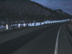 視線誘導型間隔保持材は、視線誘導の役割を果し、カーブ等に有効な製品である。