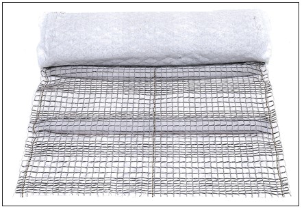 種子、客土吹付けを行う際の基礎に用いる肥料袋付きネット。法面の補強や美観を整え、降雨などによる種子および客土の流失を防止する。