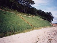 種子・肥料・保水材等と肥料袋等が装着された人工張芝。法面の保護と緑化に用いる。崩壊した斜面や、法面に張り付け植物を生育、緑化することにより斜面を安定させる。