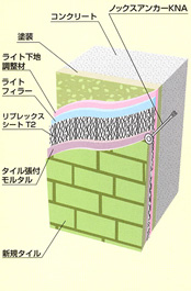 鉄筋コンクリート構造および鉄骨鉄筋コンクリート構造の建築物における外壁等の既存仕上の上に新たにネット補強し、アンカーピンを留め付け、下地層を構築して、既存仕上材の落下を防止する補修工法。