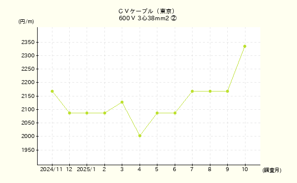 価格は、CVケーブル600V3心38mm2でm当たり2334円と前月比7.7%の上伸。しばらくは銅価が高値圏で推移するとの見方が強い中、今後も販売側、需要者側ともに銅価にらみの価格交渉が続く見込み。目先、横ばい。